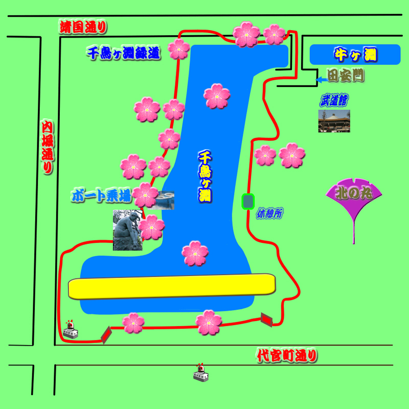 千鳥ヶ淵の桜の花見コース、花見ルート、撮影コースは上のマップのルートをお薦めしますが、ボートに乗って、水面から見上げる桜が最高です。