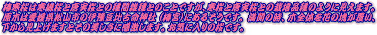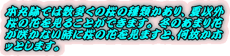 皇居東御苑本丸跡で咲きます、ジュウガツザクラ、フユザクラ、カンザクラ、カワヅザクラ、カラミザクラ(シナミザクラ)、ツバキカンザクラ、アマギヨシノ、エドヒガン、コヒガン、シダレザクラ、ニシノミヤゴンゲンダイラザクラです。