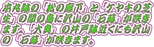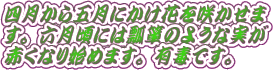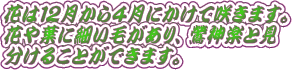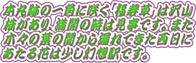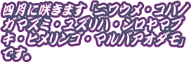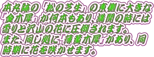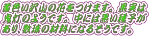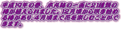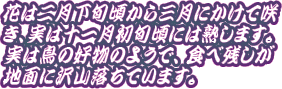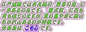 江戸城の本丸跡です。現在は皇居東御苑となり、日本の野山で見られる、沢山の植物などが植えられており、四季折々の花が楽しめます。ここでは、「カンアオイ、ロウバイ、シナマンサク、フクジュソウ、ミツマタ、クロヤナギ、マボケ、アケボノアセビ、ミスミソウ、サンシュユ、トサミズキ、シデコブシ、カタクリ、ヒュウガミズキ、イカリソウ、アカボシシャクナゲ、ミヤマウグイスカグラ、マルバアオダモ、ムシカリ、ヒョウタンボク、シジミバナ、キエビネ、オドリコソウ、ハナイカダ、コデマリ、トチノキ、ナンジャモンジャ、コアジサイ、サラサドウダン、ハクウンボク、ゴンズイ、ツリバナ、ナツグミ、ヤブムラサキ、ウメモドキ、ヤマボウシ、タラヨウ、ユキノシタ、オオアマナ、ムラサキシキブ、ハナシノブ、シモツケ、モクゲンジ、アジサイ、コムラサキ、シロミノコムラサキ、ミナヅキ、マツムシソウ、シュウカイドウ、ツユクサ、シュウメイギク、ヌスビトハギ、ミズヒキ、キンモクセイ、ウスギモクセイ、ヤブムラサキ、キチジョウソウ、ナイチンゲール(バラ)などの花と実を紹介しています。」