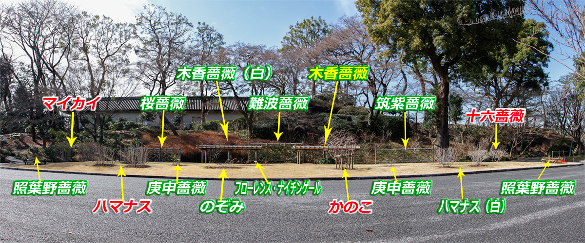 皇居東御苑本丸跡の薔薇園に咲く薔薇の種類は、テリハノイバラ、マイカイ、ハマナス(赤・白)、サクラバラ、コウシンバラ、ノゾミ、フローレンス・ナイチンゲール、ナニワイバラ、モッコウバラ(黄・白)、カノコ、ツクシイバラ、イザヨイバラです。山椒薔薇(サンショウバラ)も薔薇園にありますが、本丸跡の山椒薔薇(サンショウバラ)をまとめたものが、 こちら です。