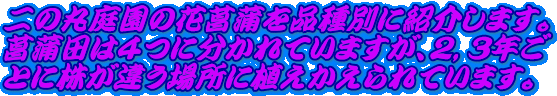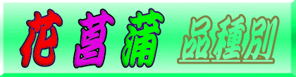 | 花菖蒲の品種別の紹介です。皇居東御苑二の丸庭園の花菖蒲の品種別です。平成20年ではアオイノウエ(葵の上)、アオイガタ(葵形)、アサカ(安積)、ダテドウグ(伊達道具)、イソチドリ(磯千鳥)、ウゴノソラ(雨後の空)、ウラヤスノマイ(浦安の舞)、エンユウノソラ(煙夕の空)、サルオドリ(猿踊)、オクアオイガタ(奥葵形)、オクバンリ(奥万里)、オキツシラナミ(沖津白波)、カモガワ(加茂川)、カモマツリ(賀茂祭)、カマタニシキ(鎌田錦)、キョウダイサン(鏡台山)、タマホコ(玉鉾)、ニシキノシトネ(錦の褥)、ツクモガミ(九十九髪)、クマフンジン(熊奮迅)、グンザンノユキ(群山の雪)、コキノイロ(古稀の色)、コスイノイロ(湖水の色)、コショウ(虎嘯)、サツキバレ(五月晴)、ゴコノアソビ(五湖遊)、ゴセチノマイ(五節の舞)、御所遊(ゴショアソビ)、黒雲(クロクモ)、佐保路(サボジ)、佐野の渡(サノノワタシ)、座間の森(ザマノモリ)、桜川(サクラガワ)、三笠山(ミカサヤマ)、三歳松風(ミトセマツカゼ)、蛇籠の波(ジャカゴノナミ)、十二単衣(ジュウニヒトエ)、初鴉(ハツオオム)、小町娘(コマチムスメ)、松葉重(マツバガサネ)、深窓佳人(シンソウカジン)、真鶴(マナツル)、神代の昔(カミヨノムカシ)、翠簾(スイレン)、酔美人(スイビジン)、泉川(イズミカワ)、大江戸(オオエド)、大神楽(オオカグラ)、大鳥毛(オオトリゲ)、大盃(オオサカズキ)、藤娘(フジムスメ)、淡仙女(アワセンニョ)、鶴の毛衣(ツルノケゴロモ)、鶴鵲楼(カクジャクロウ)、都の巽(ミヤコノタツミ)、ヒノデヅル(日出鶴)、ヌレガラス(濡烏)、シライトノタキ(白糸の滝)、ムサシガワ(武蔵川)、ホウオウカン(鳳凰冠)、バンリノヒビキ(万里響)、ユウヒガタ(夕日潟)、レンジョウノタマ(連城の璧)、ナミノリブネ(波乗舟)、バンダイノナミ(万代の波)、ニジノトモエ(霓の巴)を紹介しています。 |