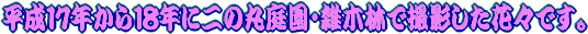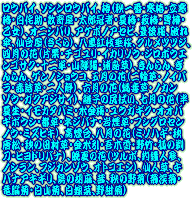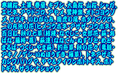 | 皇居東御苑の花-寒緋桜、土筆(ツクシ)、春蘭、キブシ、大島桜、山桜、シャガ、エビネ、アマドコロ、アヤメ、ウグイスカグラ、オトコヨウゾメ、サツキ、イワガラミ、オカトラノオ、ホタルブクロ、二の丸池の花(ヒメコウホネ、アサザ、コウホネ)、百日紅、秋の七草(桔梗・ナデシコ、女郎花/オミナエシ、ハギ、オバナ、フジバカマ、クズ)、萩類(ナンテンハギ、ヌスビトハギ、メドハギ、マルバハギ、ツクシハギ、ヤマハギ)、ツリフネソウ、秋の花々(リンドウ、アキノノゲシ、イヌホウズキ、カリガネソウ)、トネアザミ、カシワバハグマ、ヤマホトトギス、タイワンホトトギス、ホトトギス、サラシナショウマ、ロウバイ、ソシンロウバイ、椿(秋一番、寒椿、タチカンツバキ、シロワビスケ、数奇屋/スキヤ、太郎冠者、夏椿、藪椿、雪椿、乙女)、オニシバリ、アケボノアセビ、豊後梅/ブンゴウメ、ヤブレガサ、仙台屋/センダイヤ、八重紅枝垂桜、クルメツツジ、四月の花(カタクリ、チゴユリ、イカリソウ、ジロボウエンゴサク、十二単、ヤマツツジ、浦島草/ウラシマソウ)、キンラン、ギンラン、ゲンノショウコ、五月の花(ニリンソウ、ノイバラ、アカツメソウ、二人静)、六月の花(ハエドクソウ、ノカンゾウ、ガクアジサイ)、ママコノシリヌグイ、七月の花(半夏生、イモカタバミ、ミズキンバイ、ユウガギク、オオバギボウシ、ミヤコグサ、ネジバナ、岩煙草/イワタバコ、フシグロセンノウ、ミズヒキ)、タカトウダイ、八月の花(ミソハギ、アキカラマツ、アキノタムラソウ、キンミズヒキ、ワレモコウ、ノダケ、キツネノカミソリ、ヒヨドリバナ)、晩夏の花(ツルボ、ツリガネニンジン、ノシラン、フジカンゾウ、男郎花/オトコエシ)、仙人草/センニンソウ、キバナアキギリ、烏の胡麻/カラスノゴマ、アカネ、秋の野菊(菊渓菊/キクタニギク、竜脳菊/リュウノウギク、白山菊/シラヤマギク、白嫁菜/シロヨメナ、野紺菊/ノコンギク)を紹介しています。これらの花々は皇居東御苑の二の丸庭園で咲きます。 |