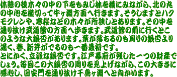 江戸城北の丸跡の北の丸公園の「花木園」、「田安門」、「田安門の製作者刻印」、「大銀杏」や散歩道を紹介しています。