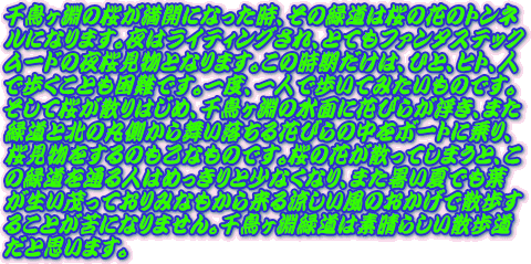 千鳥ヶ淵の紹介です。千鳥ヶ淵緑道と北の丸の土手とにある濠を千鳥ヶ淵と呼んでいますが、千鳥ヶ淵の桜はその季節になりますと、夜にはライトアップされ、昼も夜も千鳥ヶ淵の桜は最高です。