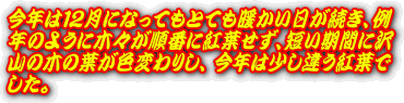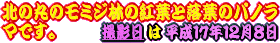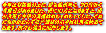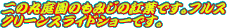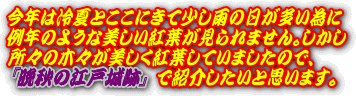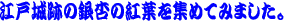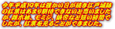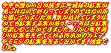 このページは皇居東御苑本丸跡・二の丸庭園・二の丸雑木林、北の丸公園など、江戸城の紅葉、江戸城跡の紅葉、江戸城二の丸庭園の紅葉、江戸城北の丸の紅葉を紹介しております。平成20年からは全画面(フルスクリーン)スライドショーで紹介しています。